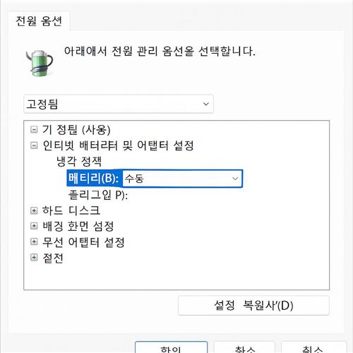 - 시스템 냉각 정책: 수동(또는 냉각 우선 해제)프로세서 탭의 시스템 냉각 정책을 수동으로 두면, 팬을 먼저 올리기보다 클록을 낮춰 발열을 줄입니다. 휴대 환경에서 소음 체감이 크게 개선됩니다.