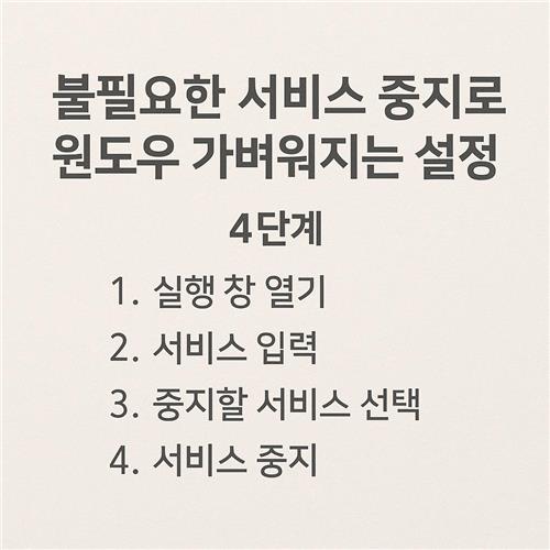 지금까지 불필요한 서비스를 정리해 윈도우를 가볍게 만드는 4단계를 함께 살펴봤습니다. 생각보다 복잡해 보일 수 있지만, 한 번만 차근차근 따라 해 보면 다음에는 훨씬 수월하게 관리할 수 있을 거예요. 중요한 점은 남들이 정리한 목록을 그대로 따라 하기보다는, 내가 실제로 사용하는 기능과 프로그램에 맞춰 나만의 설정을 만드는 것입니다. 오늘 정리한 내용을 기준으로, 앞으로 프로그램을 새로 설치할 때마다 자동 실행과 서비스가 함께 추가되는지 한 번 더 확인하는 습관을 들이면, 시간이 지나도 느려지지 않는 쾌적한 윈도우 환경을 유지하는 데 큰 도움이 될 것입니다. 여러분도 이번 기회에 한 번 시간을 내어, 내 PC를 위한 기본 셋업을 깔끔하게 정리해 보시면 어떨까요.