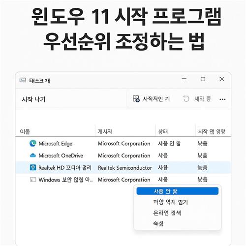 윈도우11, 시작프로그램, 부팅속도, 자동실행, 작업관리자, 시스템최적화, 컴퓨터팁, PC관리, 성능향상, 윈도우설정
