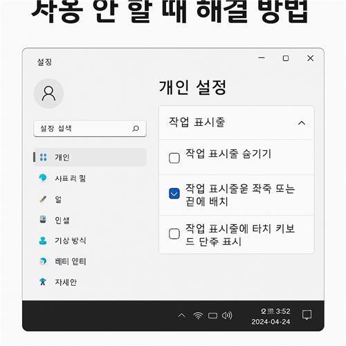 - 작업표시줄 설정으로 이동설정 메뉴에서 [개인 설정] → [작업표시줄]을 클릭합니다.