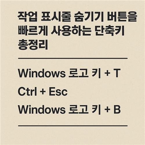 윈도우에서 작업 표시줄을 숨기고 싶을 때, 바로 사용할 수 있는 단축키는 없지만 빠르게 설정 메뉴로 접근하거나, 전체 화면을 활성화하는 키 조합이 유용하게 쓰입니다. 대표적으로 아래와 같은 키들이 있습니다.