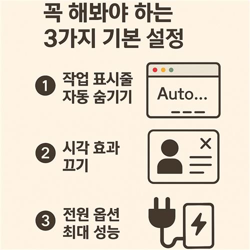 지금까지 알려드린 설정들은 누구나 쉽게 따라할 수 있으면서도 효과는 꽤나 만족스러운 방법들이에요. 한 번만 설정해두면 그 이후로는 더 편하고 빠른 환경에서 컴퓨터를 사용할 수 있답니다.