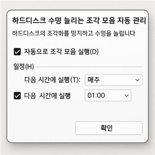 조각 모음 자체가 하드디스크를 망가뜨리는 것은 아니지만, 너무 자주 또는 잘못된 방식으로 실행하면 부담이 될 수 있습니다. 자동 관리 주기를 적절하게 설정하는 것이 수명 관리의 핵심이라는 점을 기억해 주세요.